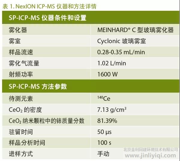 所有樣品分析均使用珀金埃爾默NexION® ICP-MS(美國(guó)康涅狄格州謝爾頓)單顆粒模式進(jìn)行。如表1所示,儀器操作條件經(jīng)過優(yōu)化,最大靈敏度適于檢測(cè)140Ce,這是儲(chǔ)量最豐富的鈰同位素,也不會(huì)受到干擾。
