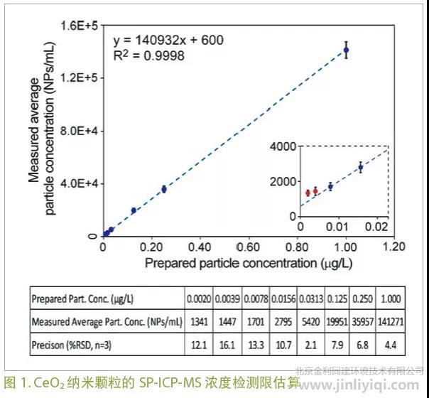 為了確定CeO2納米顆粒的方法檢出限(MDL),對(duì)由一系列0.5mg/L的CeO2納米顆粒用0.025mM焦磷酸鈉溶液稀釋得到的標(biāo)準(zhǔn)品中各種顆粒的濃度(范圍在500至256000NPs/mL)進(jìn)行了分析。如圖1 所示,測(cè)得的顆粒濃度表明顆粒濃度范圍在0.0078g/L至1g/L之間呈線性趨勢(shì)。但當(dāng)顆粒濃度進(jìn)一步降低至小于0.0078g/L時(shí),數(shù)據(jù)偏離了校準(zhǔn)曲線。這表明目前確立的SP-ICP-MS方法能夠精確檢測(cè)最低1700NPs/mL的CeO2納米顆粒,其靈敏度極高。