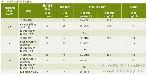 為了探究焦磷酸鈉濃度對(duì)土壤中CeO2納米顆粒提取效率的影響,采用三種不同濃度的焦磷酸鈉溶液(2.5mM,5 mM和10 mM)提取添加CeO2納米顆粒土壤樣品,并比較提取率。表2顯示2.5 mM和5 mM的焦磷酸鈉可以有效地從土壤中提取顆粒和溶解的鈰(包括小于粒徑檢測(cè)限的顆粒)。然而,10 mM的焦磷酸鈉會(huì)導(dǎo)致回收率較高。因此,通過該SP-ICP-MS方法,用于分析土壤中CeO2納米顆粒的焦磷酸鈉濃度應(yīng)在2.5至5mM范圍內(nèi)。